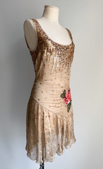 BLUMARINE 2000 Beige Silk & Gold Sequin Mini Dress (S)