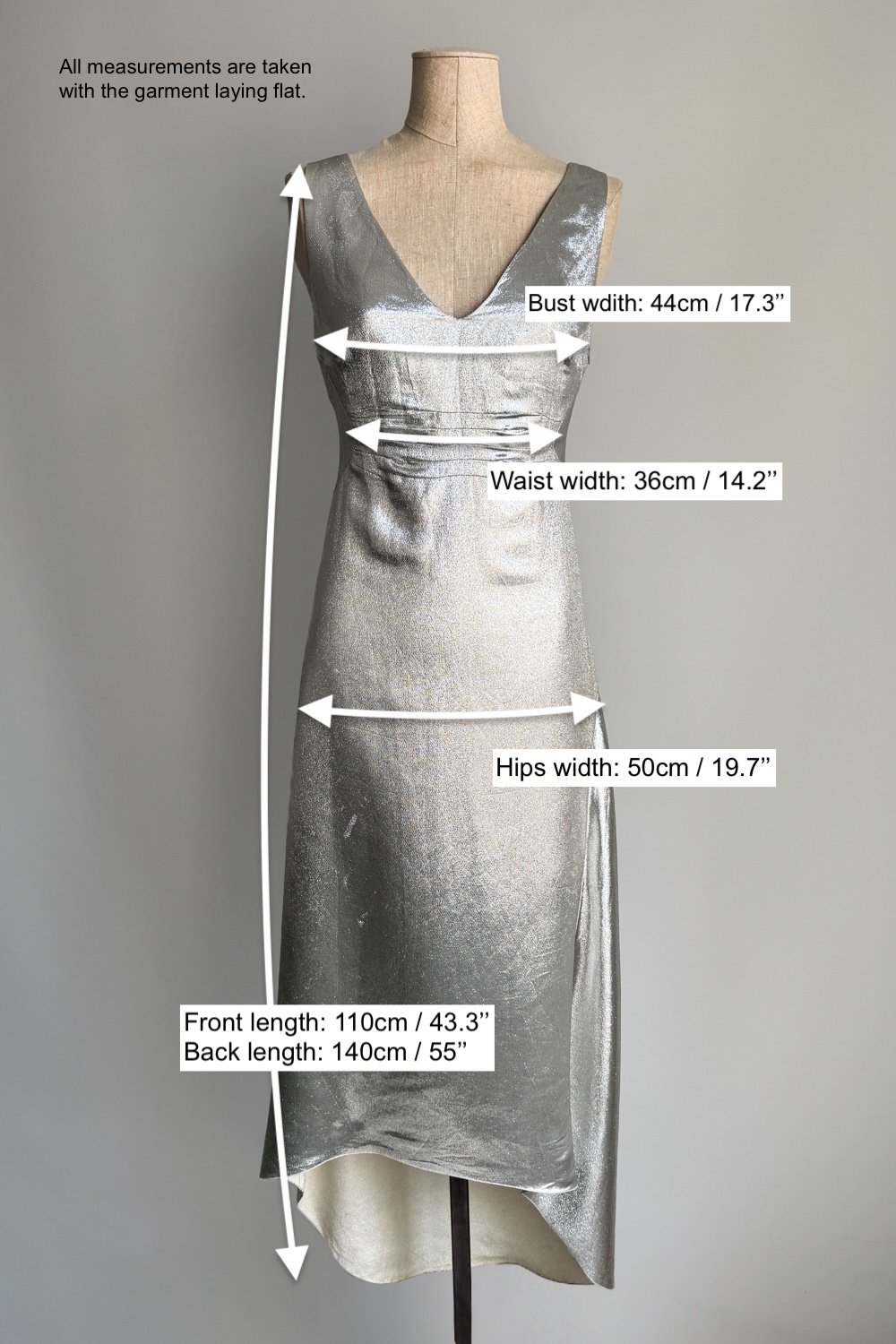 SIZE: The label indicates a size 44IT (L) but the dress fits a size M better. Please refer to the last picture to see the flat lay measurements. Bear in mind that the fabric is stretchy.