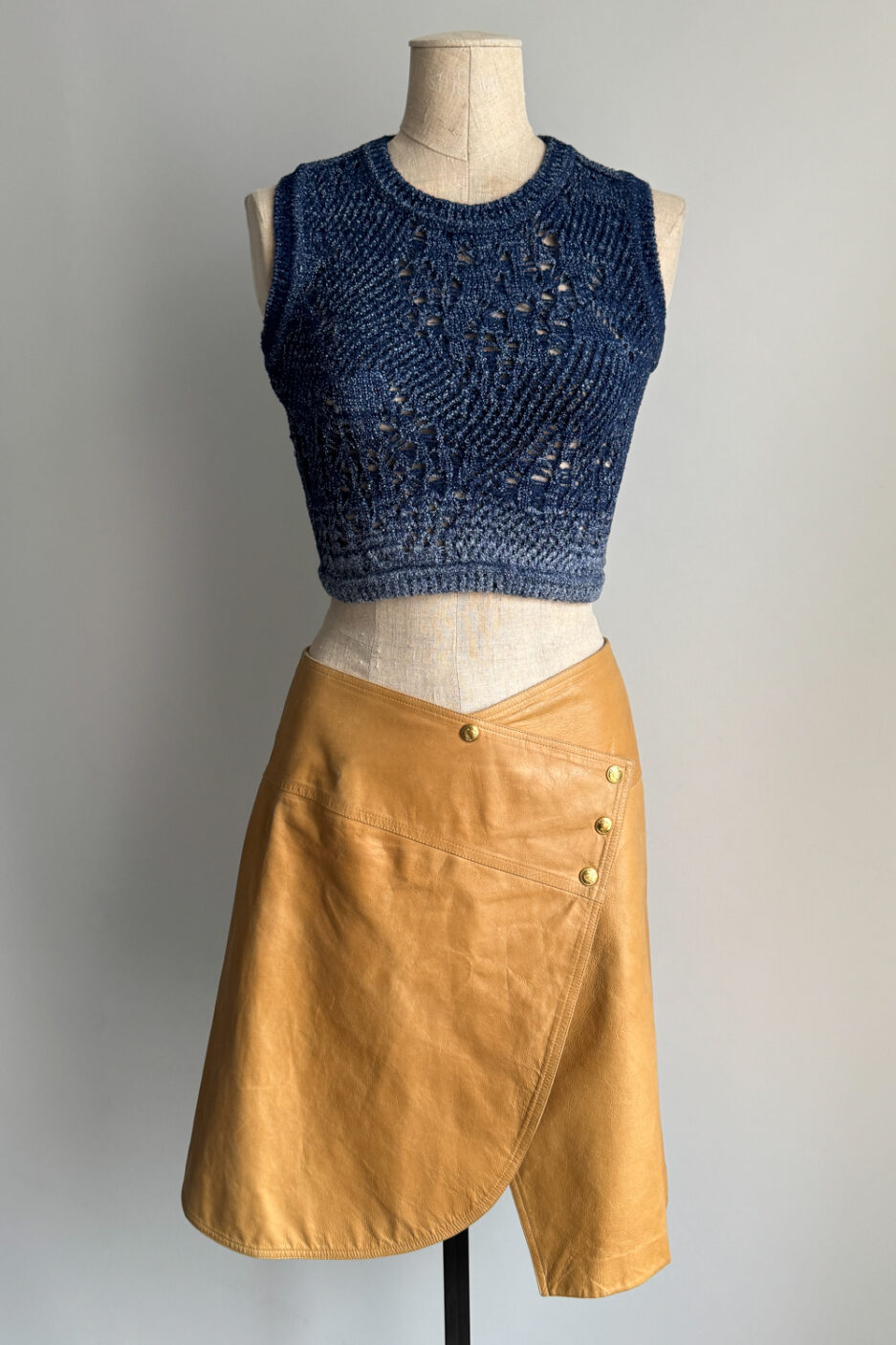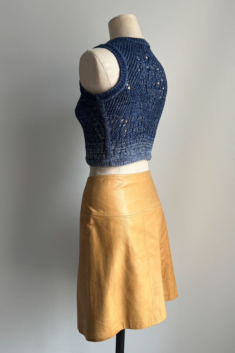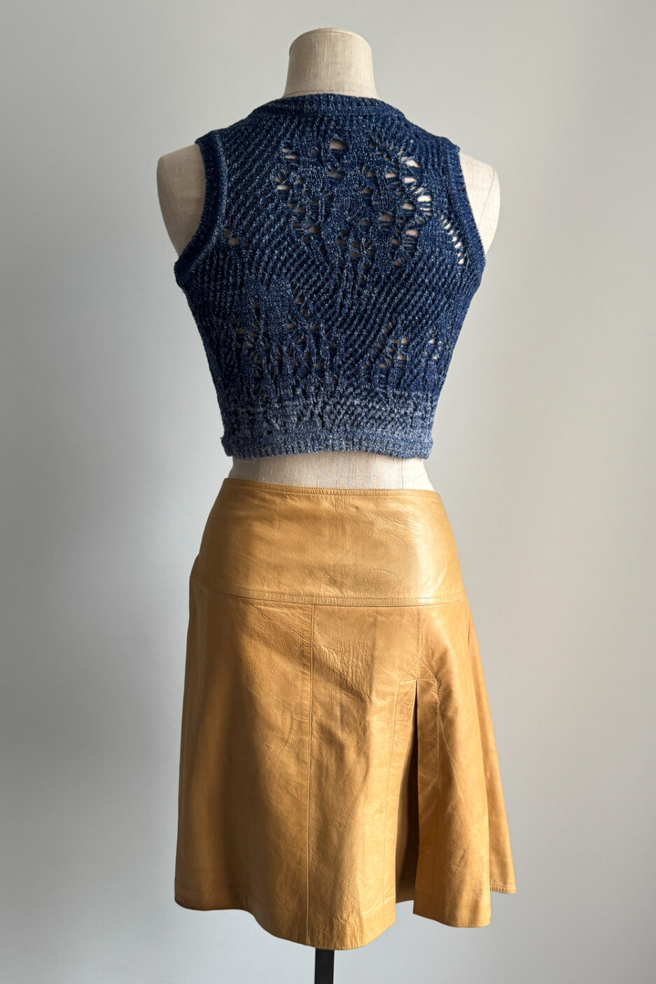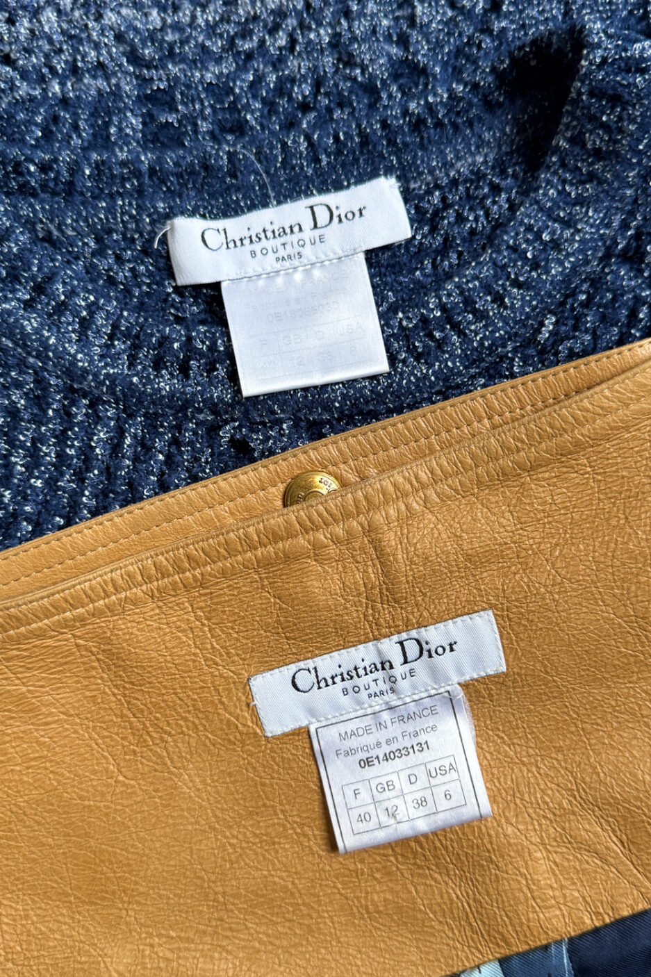 CHRISTIAN DIOR 2000 Blue Knit Crop Top & Camel Leather Skirt Set (M-L)