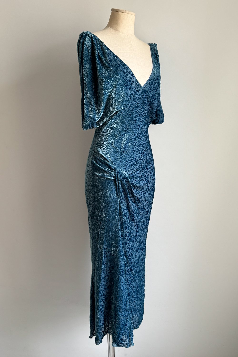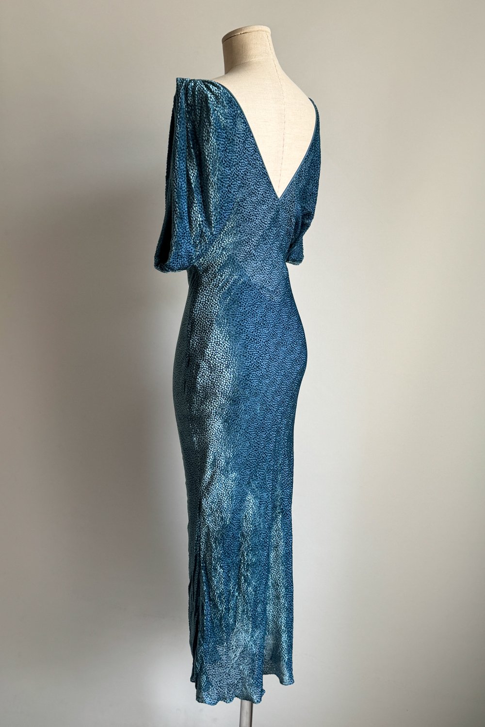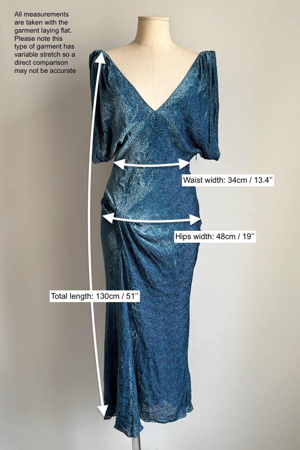 SIZE: Best fits size S. Please refer to the last picture to see the flat lay measurements. The bias cut allows the fabric to stretch.