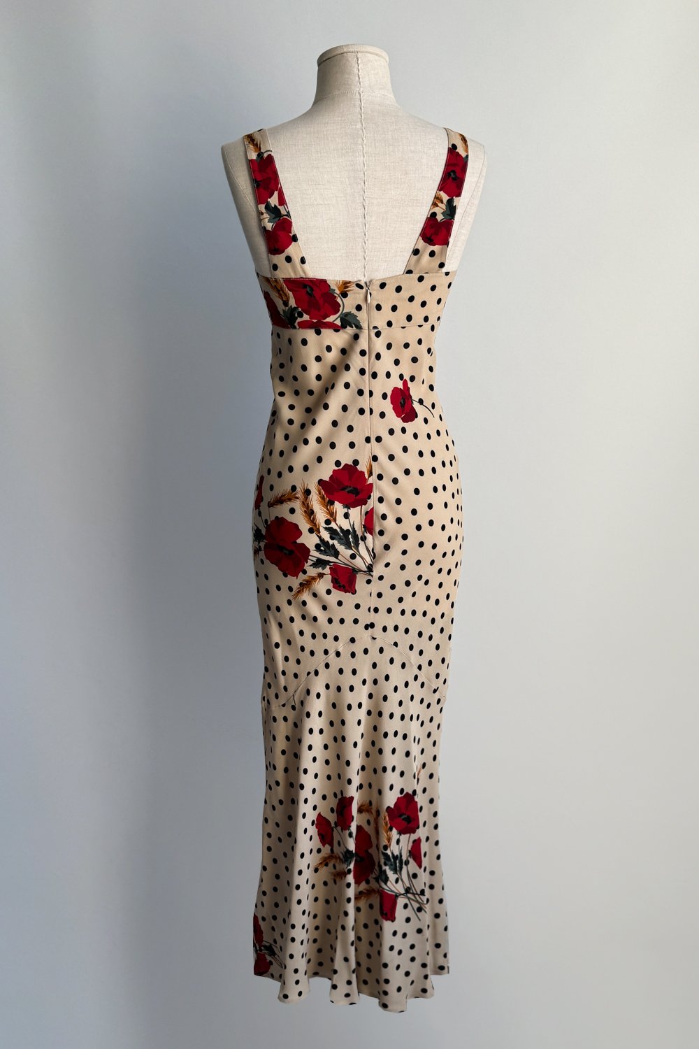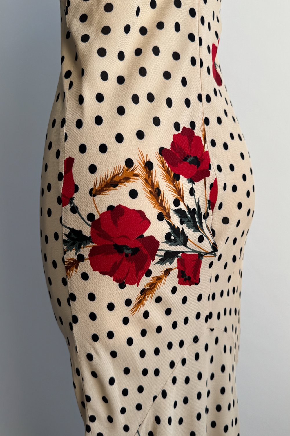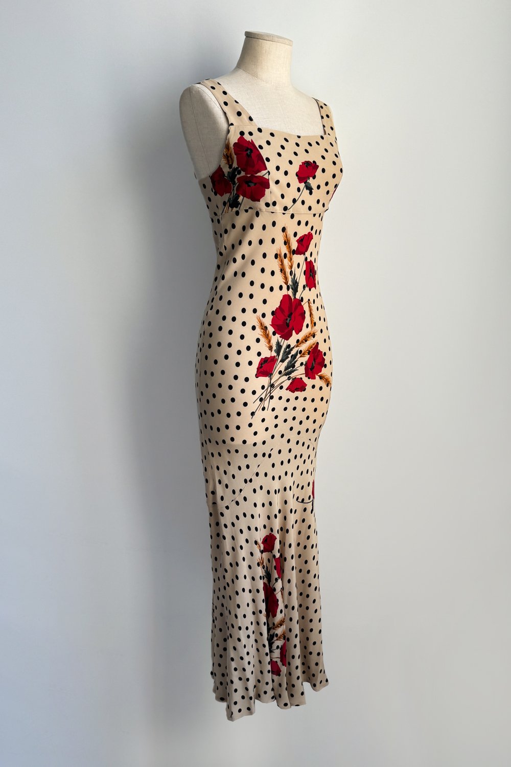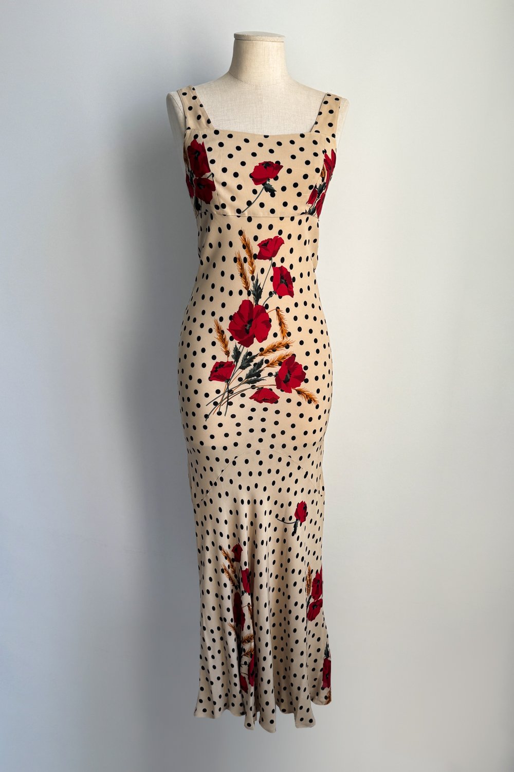 LOLITA LEMPICKA 1996 Beige Polka Dot & Poppy Print Silk Maxi Dress (XS)