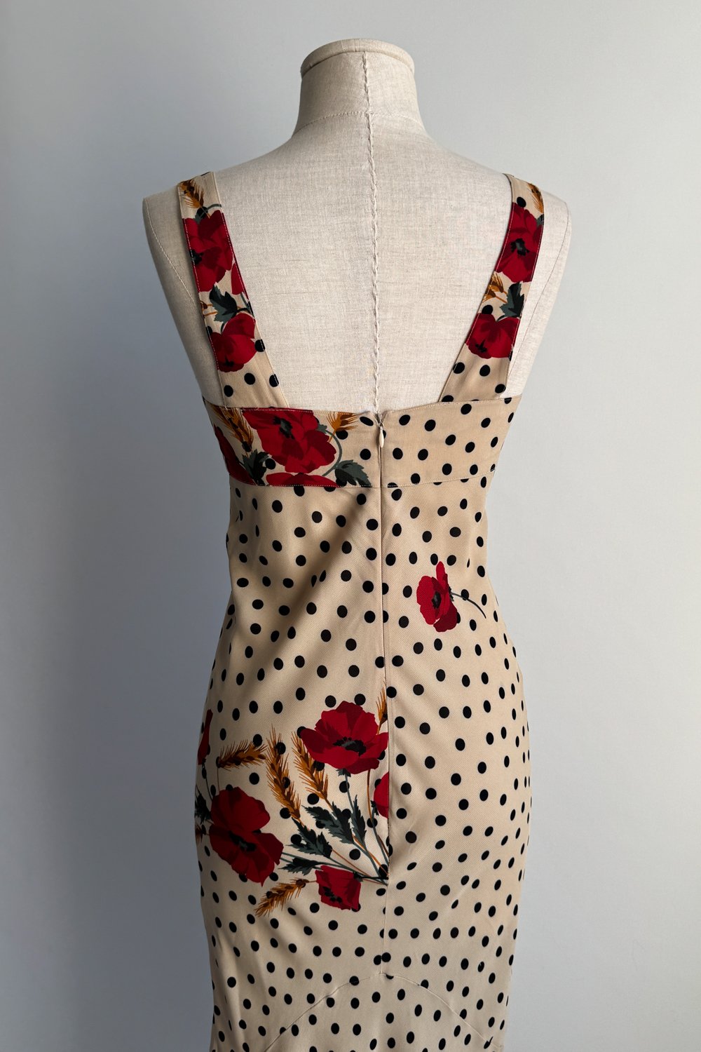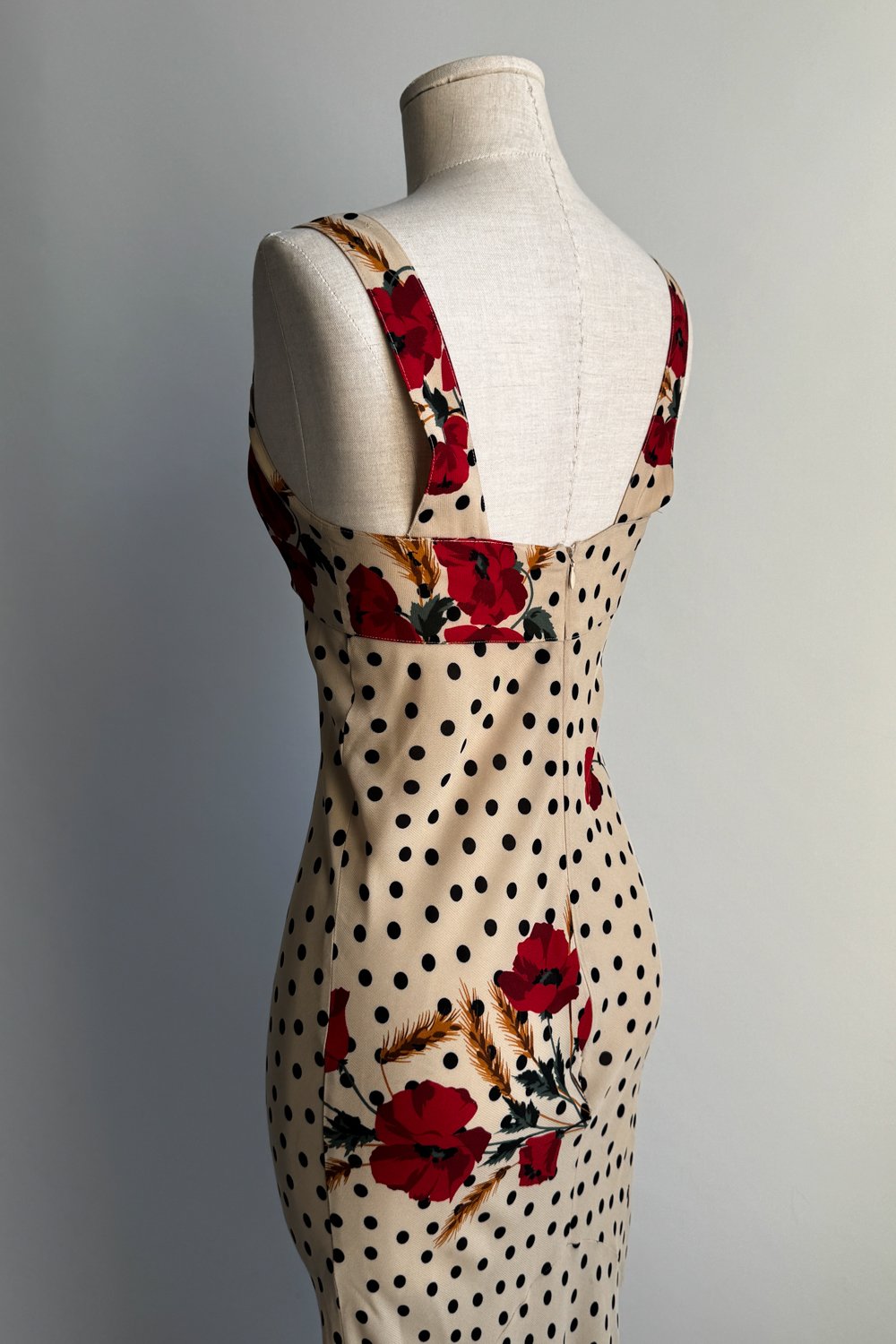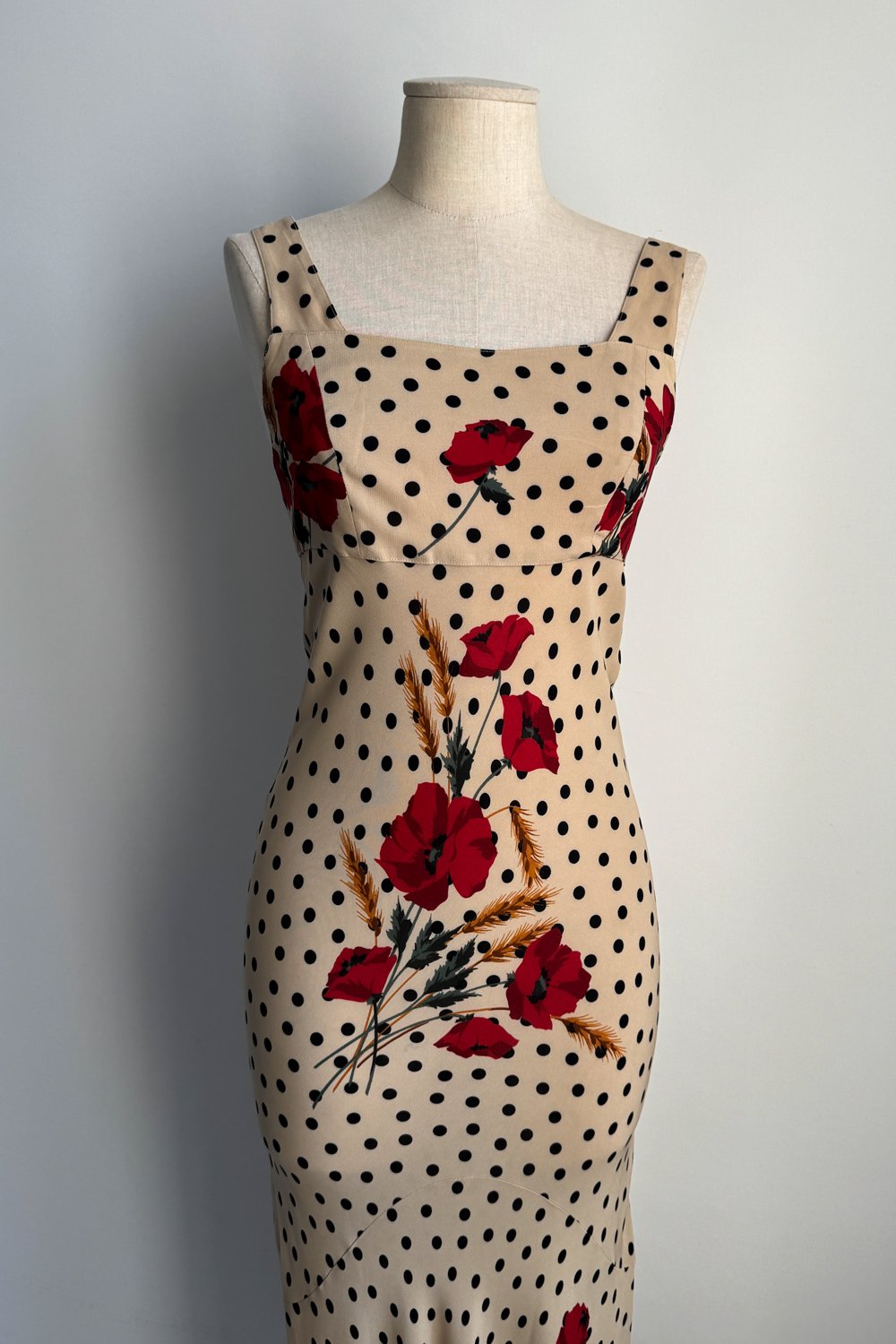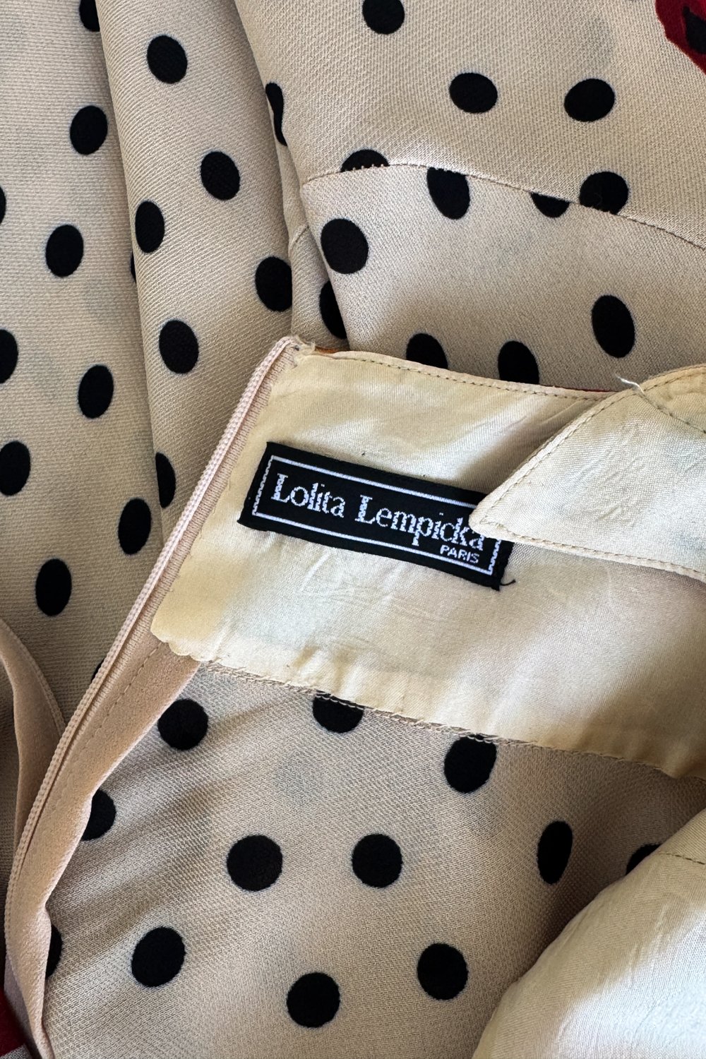 LOLITA LEMPICKA 1996 Beige Polka Dot & Poppy Print Silk Maxi Dress (XS)