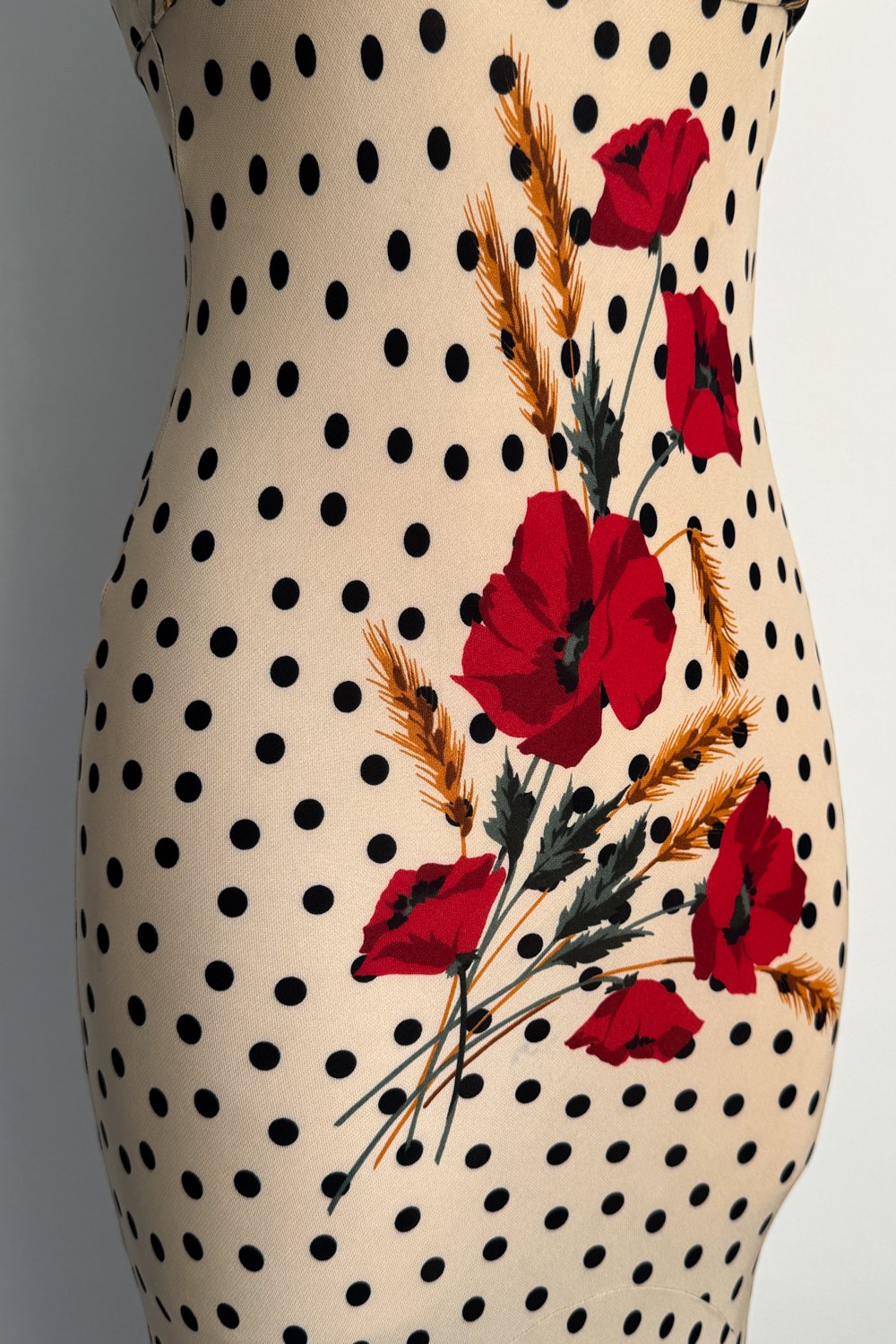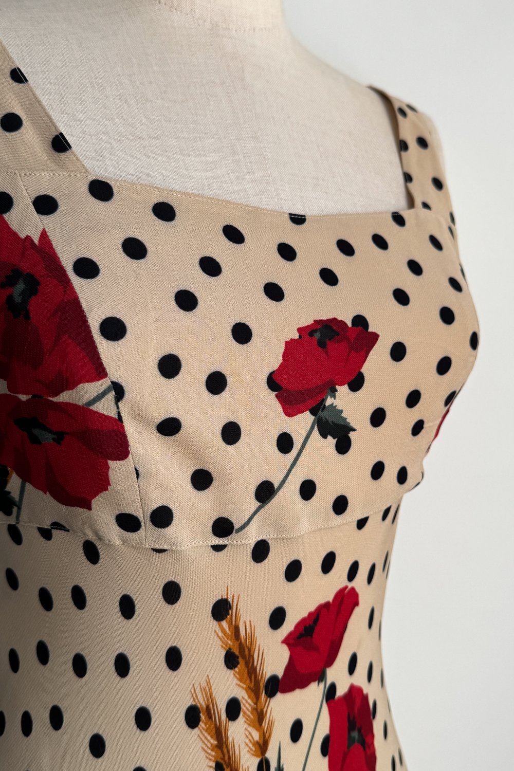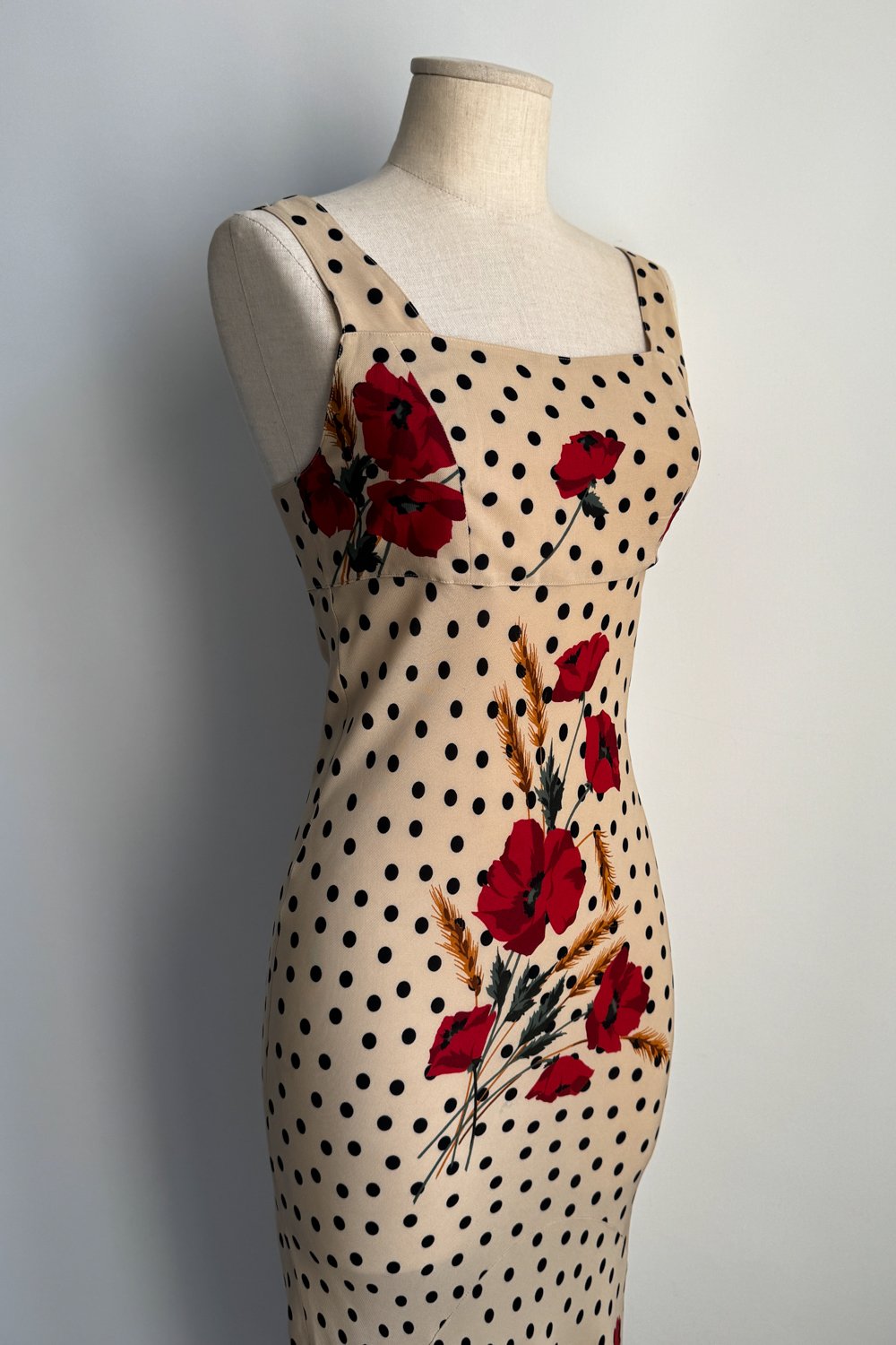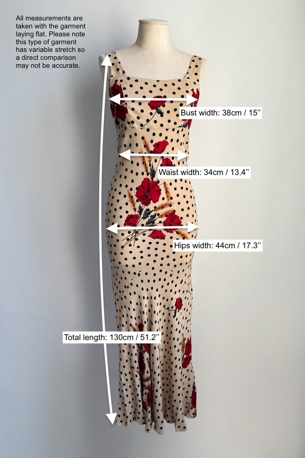 LOLITA LEMPICKA 1996 Beige Polka Dot & Poppy Print Silk Maxi Dress (XS)