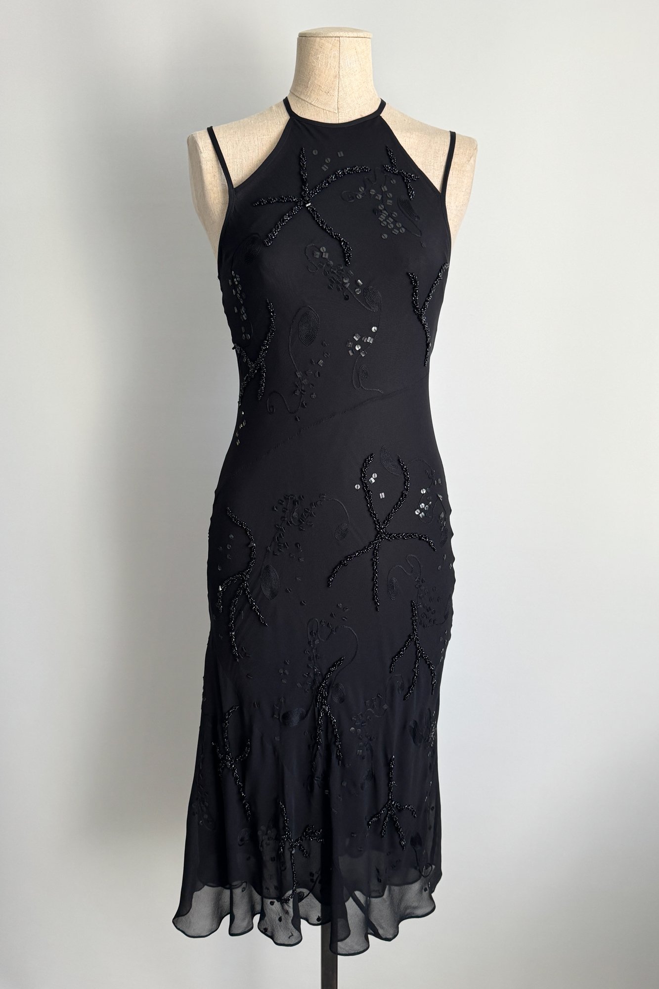 LOLITA LEMPICKA 2001 Black Silk Halter Midi Dress with Beaded Embroidery (S-M)
