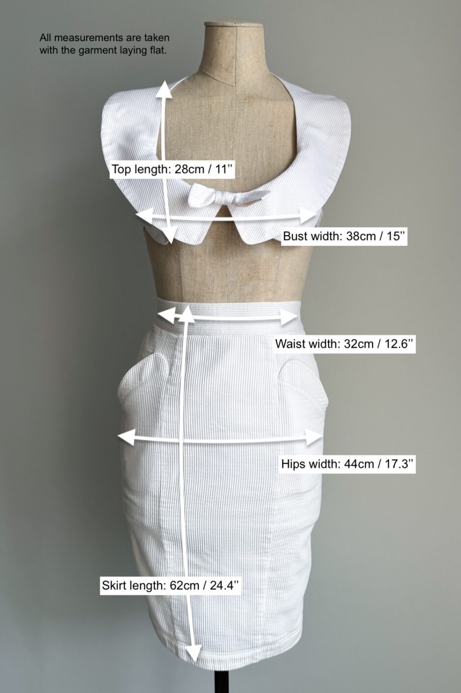 SIZE: The top is suitable for size XS-S, as the elastic band at the back is stretchy. The skirt is best suited for a size XS. Please refer to the last picture to see the flat lay measurements.