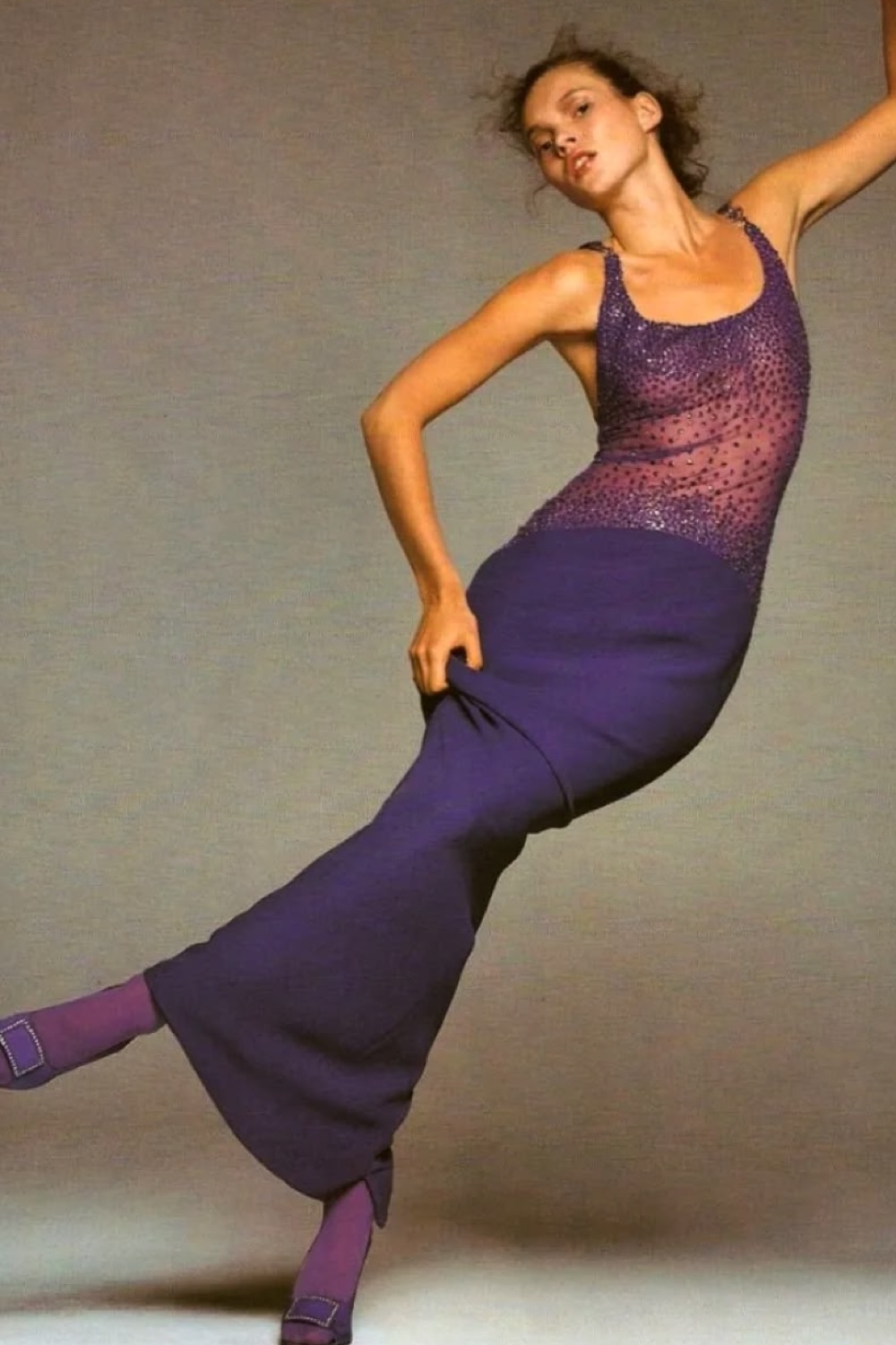 References: (1) Carla Bruni walking down the Versace Fall Winter 1996 ready-to-wear fashion show, photographed by Y. Vlamos (2) Kate Moss photographed by Richard Avedon for the Versace Fall Winter 1996 ready-to-wear ad campaign (3) Claudia Schiffer (left) and Valerie Morris (right) at the 4th annual Michael awards fashion gala (4) Anne Klevhag (left) and Zendaya (right) at the Green Carpet Fashion Awards, October 2020 (5) Carla Bruni (top left), Bella Thorne (top right), Cindy Crawford (bottom left), Alek Wek (bottom right).