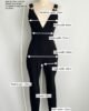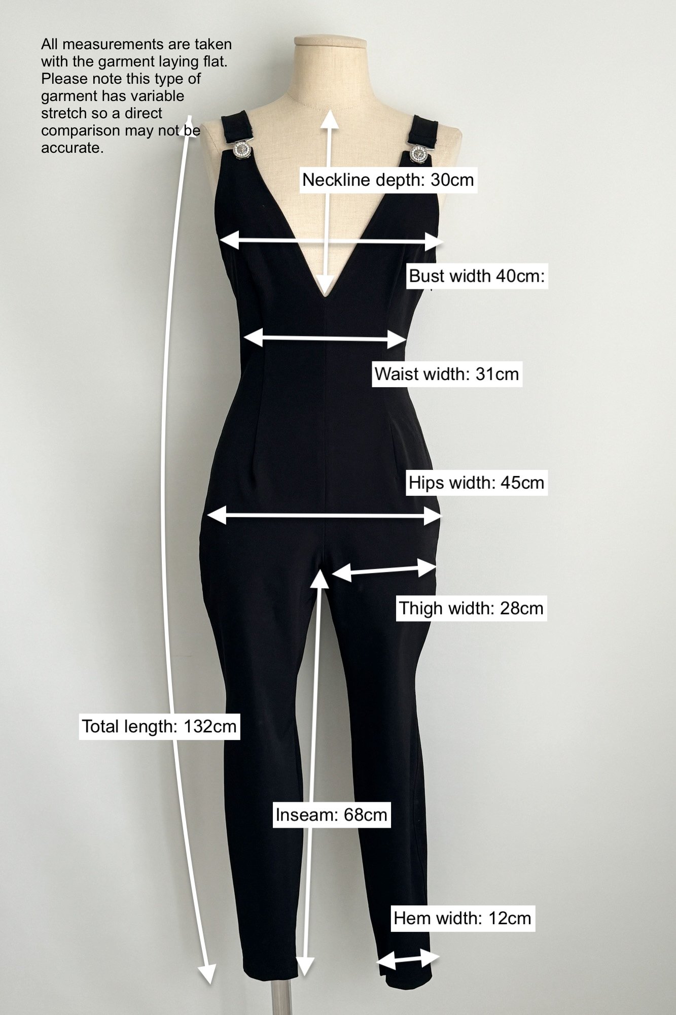SIZE: Best fits size S-M. Please refer to the last picture to see the flat lay measurements. Bear in mind that the fabric is stretchy. We do not recommend this jumpsuit for someone over 1.70m (5′ 7″) as the fastenings might pop open.