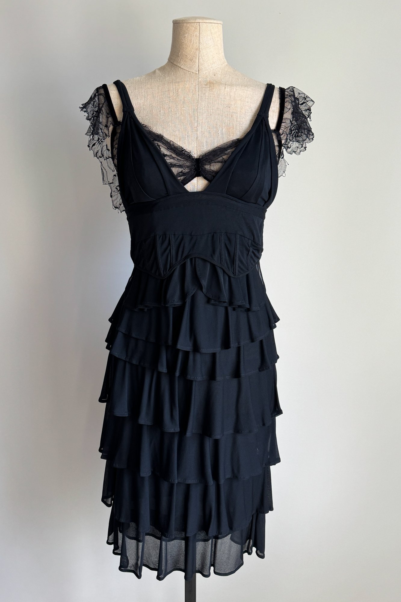 YVES SAINT LAURENT 2004 Black Ruffle Midi Dress (XS-S)